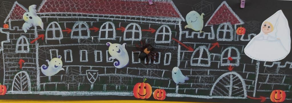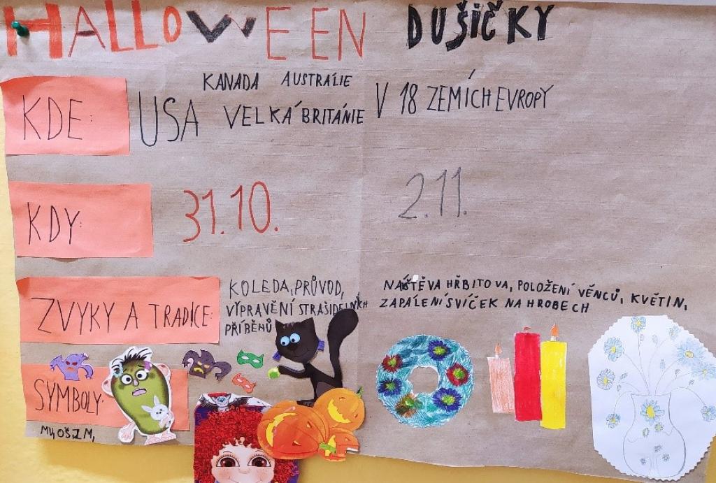 Říjnová výuka byla prostoupena tématy Haloweenu a Dušiček. Na děti čekaly například matematická úniková hra ze strašidelného zámku, práce na projektu věnovanému rozdílu mezi oběma svátky a také samozřejmě výtvarné halloweenské tvoření.